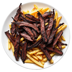Malse biefstuk, gebakken naar wens, geserveerd met frietjes